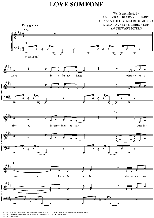 Digital Sheet Music for Love Someone by Chris Keup, Jason Mraz, Becky Gebhardt, Chaska Potter, Mai Bloomfield, Mona Tavakoli, Stewart Myers scored for Piano/Vocal/Chords; id:441491