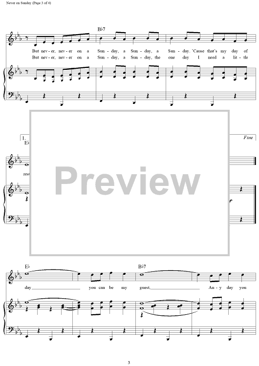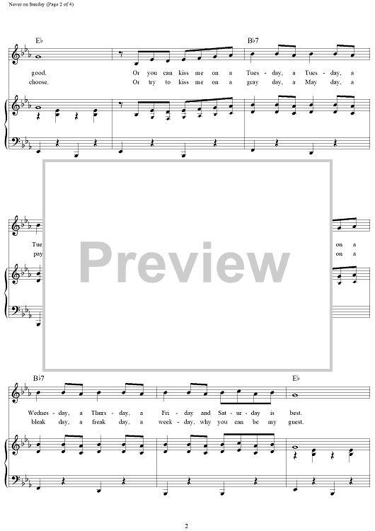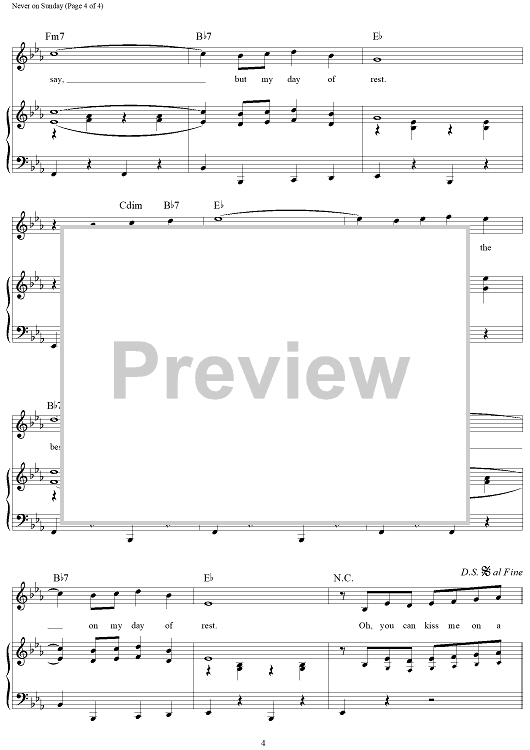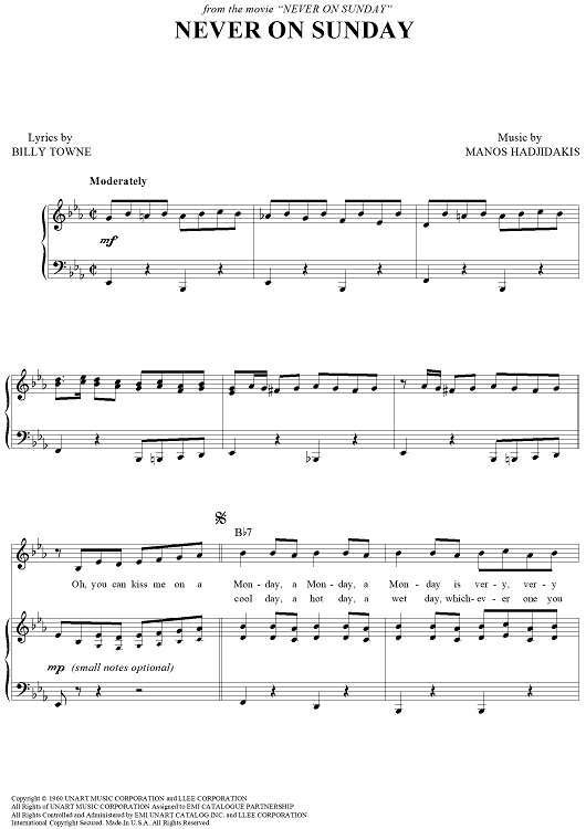 Digital Sheet Music for Never on Sunday by Manos Hadjidakis, Billy Towne, Melina Mercouri, Don Costa, The Chordettes scored for Piano/Vocal/Chords; id:116532