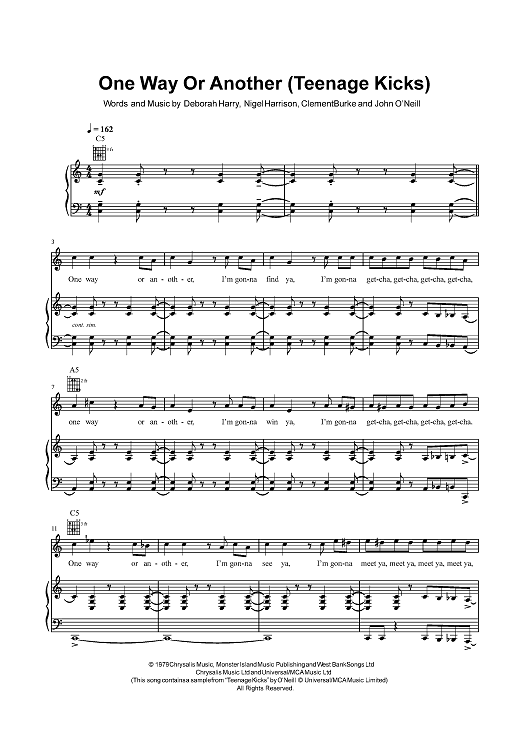 Digital Sheet Music for One Way Or Another (Teenage Kicks) by Deborah Harry, Nigel Harrison, One Direction, John O'Neill, Clement Burke scored for Piano/Vocal/Chords; id:434651
