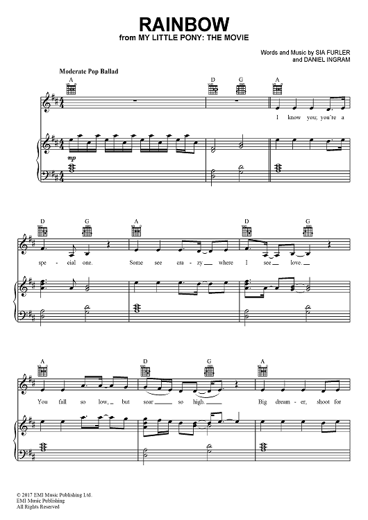 Digital Sheet Music for Rainbow - from My Little Pony: The Movie by Sia Furler, Sia, Daniel Ingram scored for Piano/Vocal/Chords; id:465650