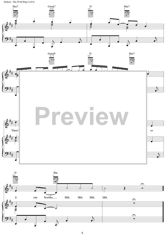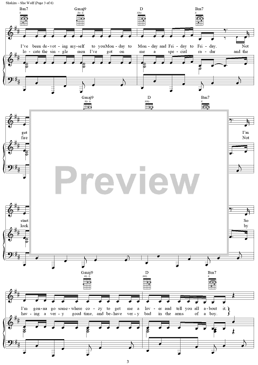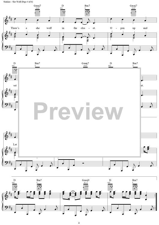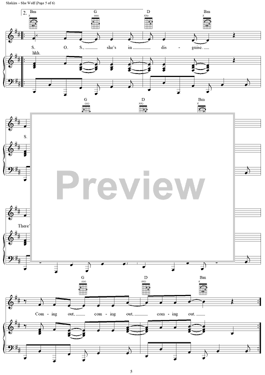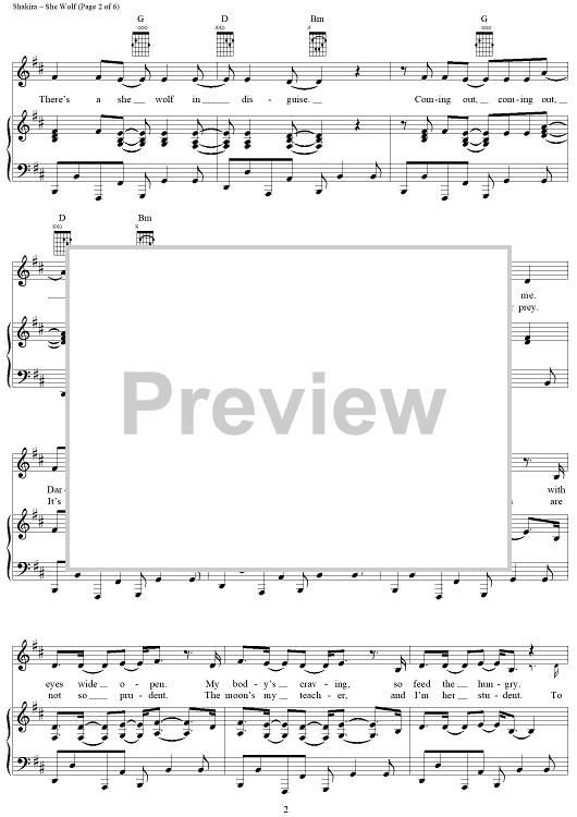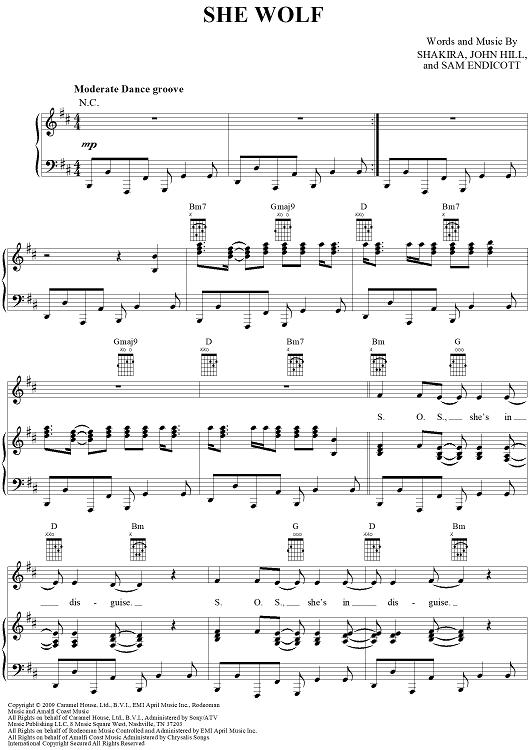 Digital Sheet Music for She Wolf by Shakira, John Hill scored for Piano/Vocal/Chords; id:409718