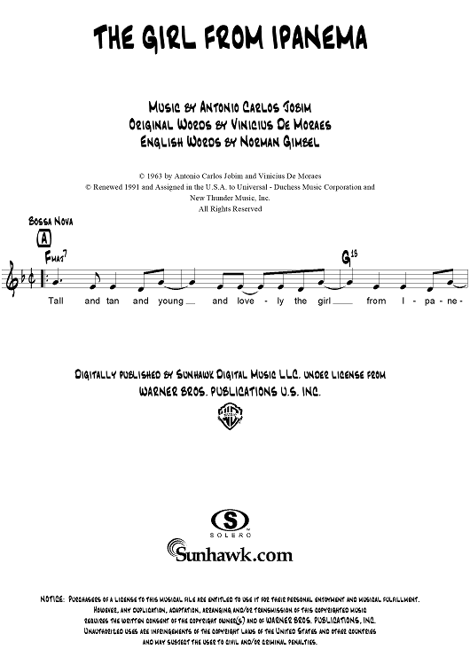 Digital Sheet Music for The Girl from Ipanema by Antonio Carlos Jobim, Vinicius de Moraes scored for Lead Sheet; id:307481
