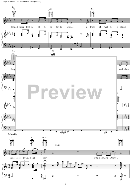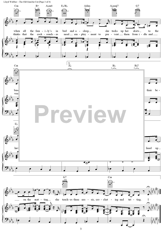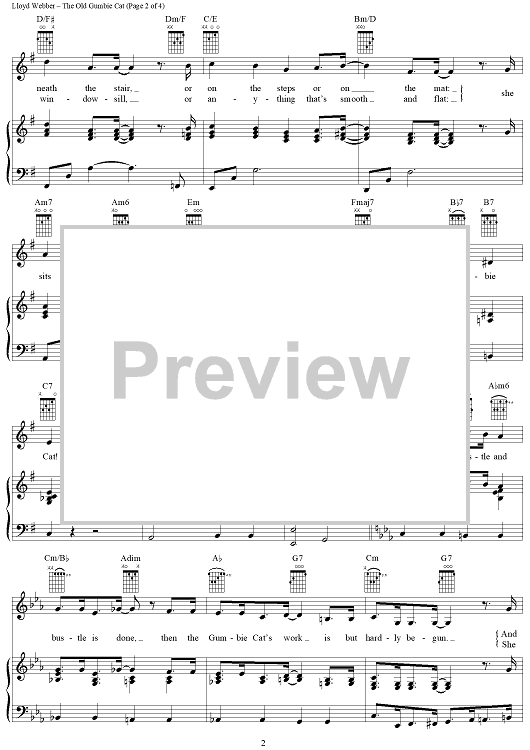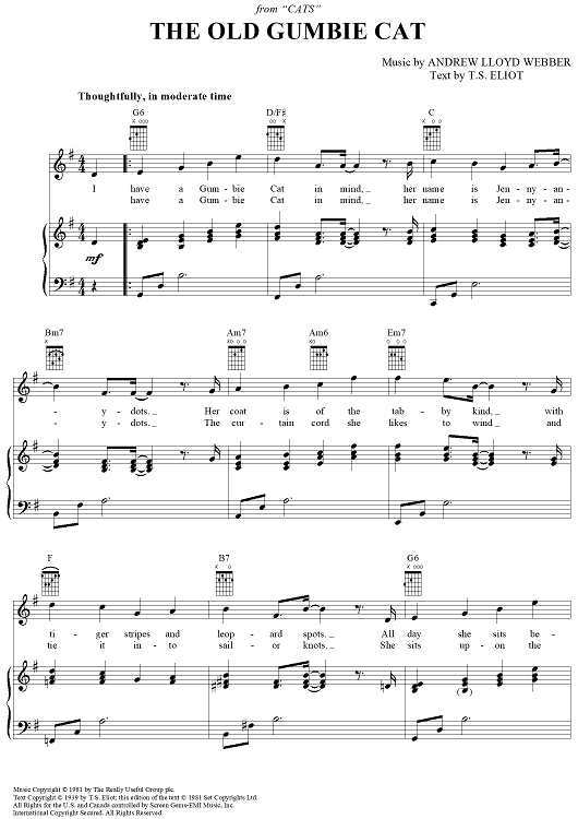 Digital Sheet Music for The Old Gumbie Cat by Andrew Lloyd Webber, T.S. Eliot scored for Piano/Vocal/Chords; id:403171