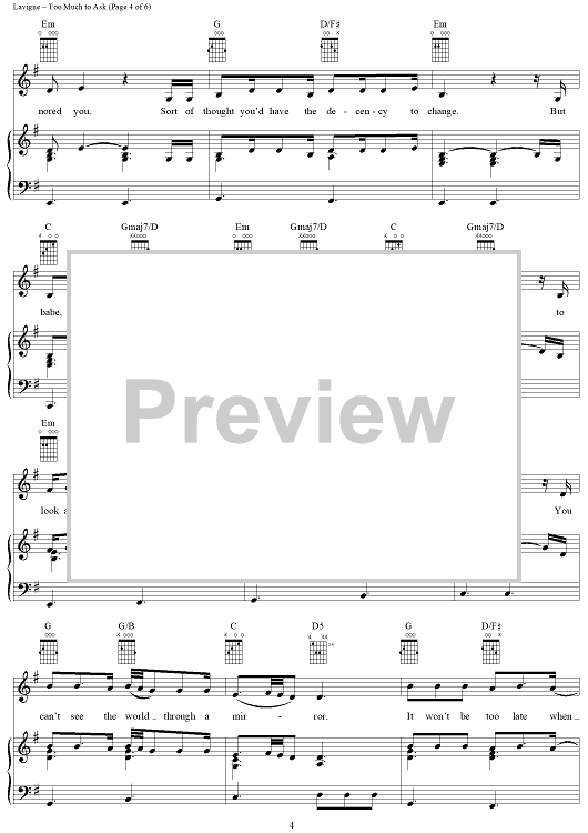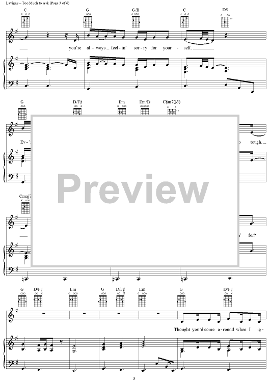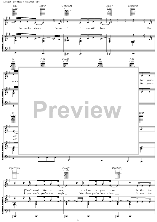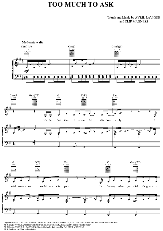 Digital Sheet Music for Too Much to Ask by Clif Magness, Avril Lavigne scored for Piano/Vocal/Chords; id:367131