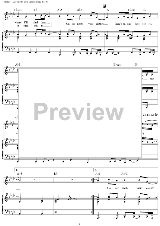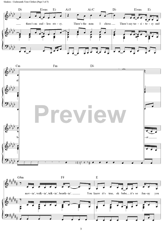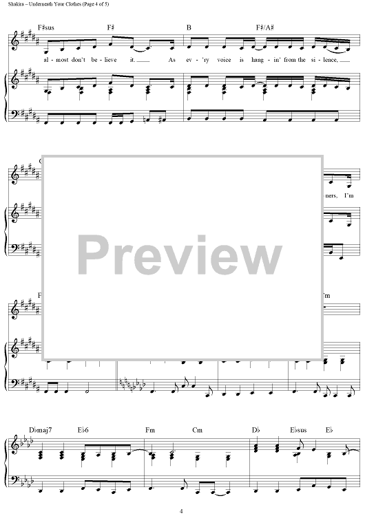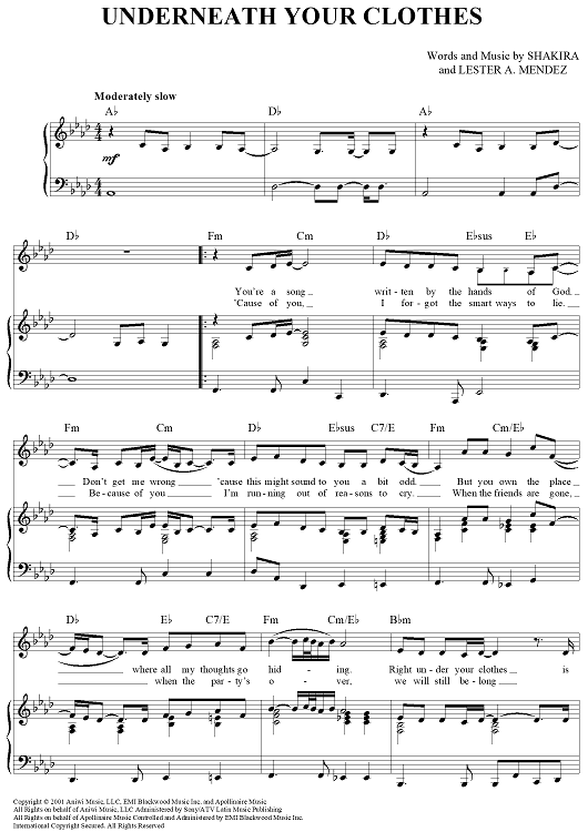 Digital Sheet Music for Underneath Your Clothes by Shakira, Lester Mendez scored for Piano/Vocal/Chords; id:362918