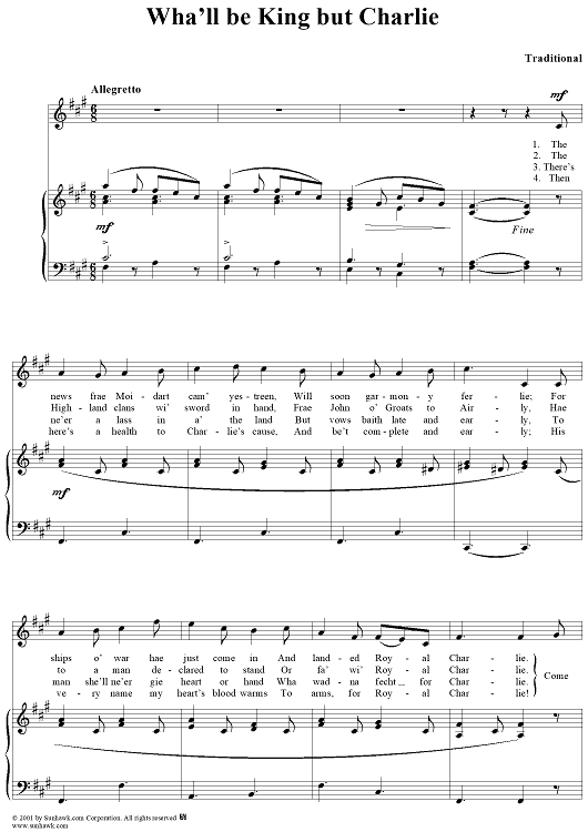 Digital Sheet Music for Wha'll be King but Charlie by Traditional scored for Piano/Vocal; id:257915