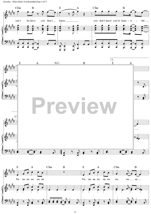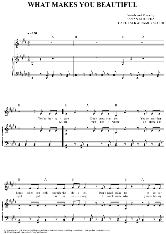 Digital Sheet Music for What Makes You Beautiful by Savan Kotecha, Rami Yacoub, One Direction, Carl Falk scored for Piano/Vocal/Chords; id:430134