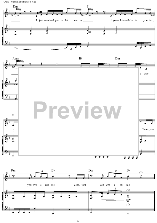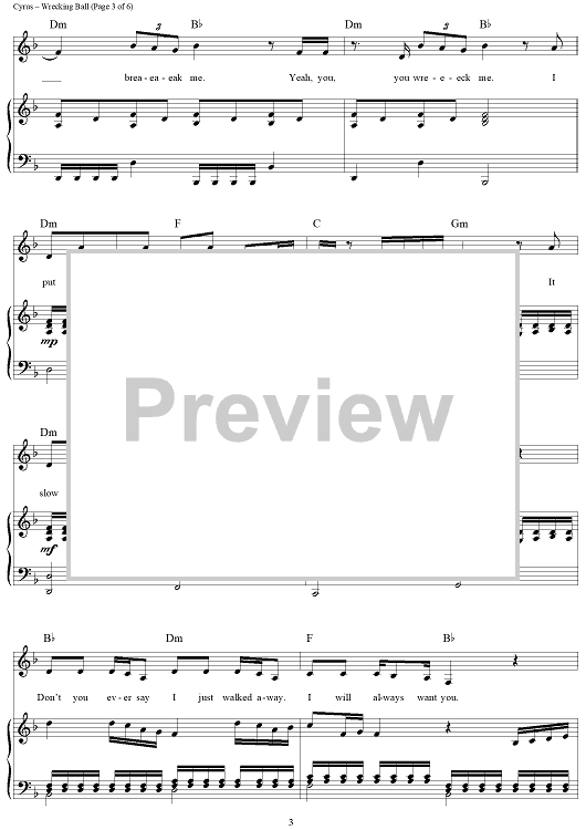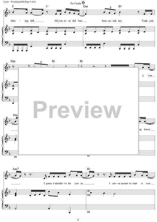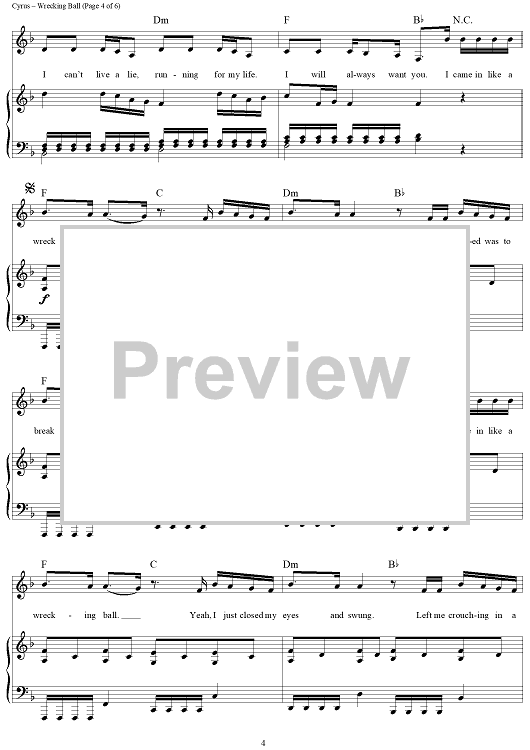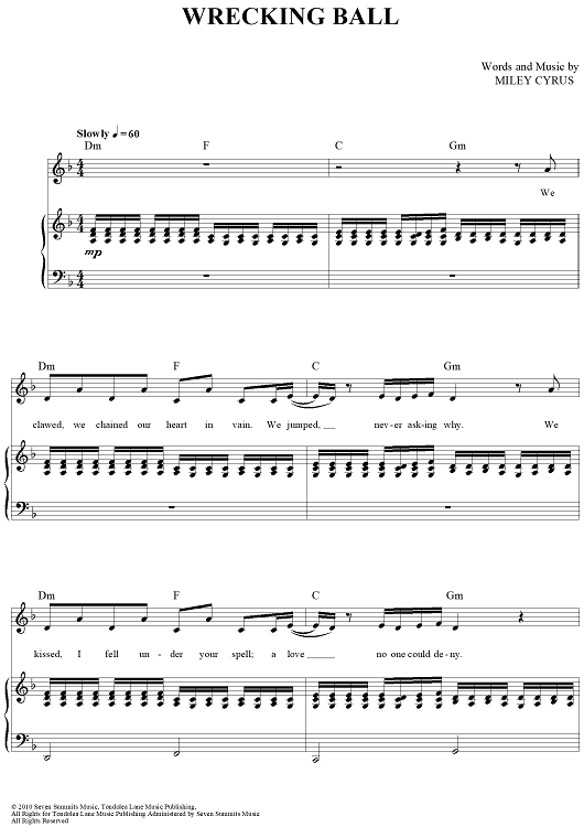 Digital Sheet Music for Wrecking Ball by Miley Cyrus scored for Piano/Vocal/Chords; id:437993