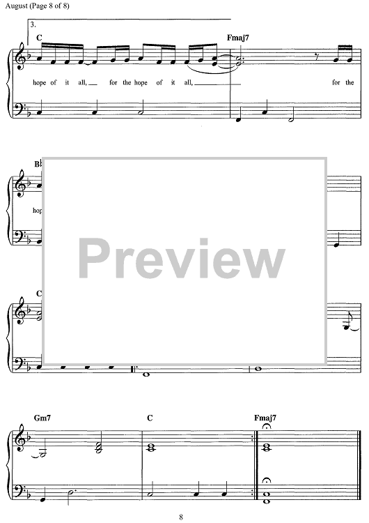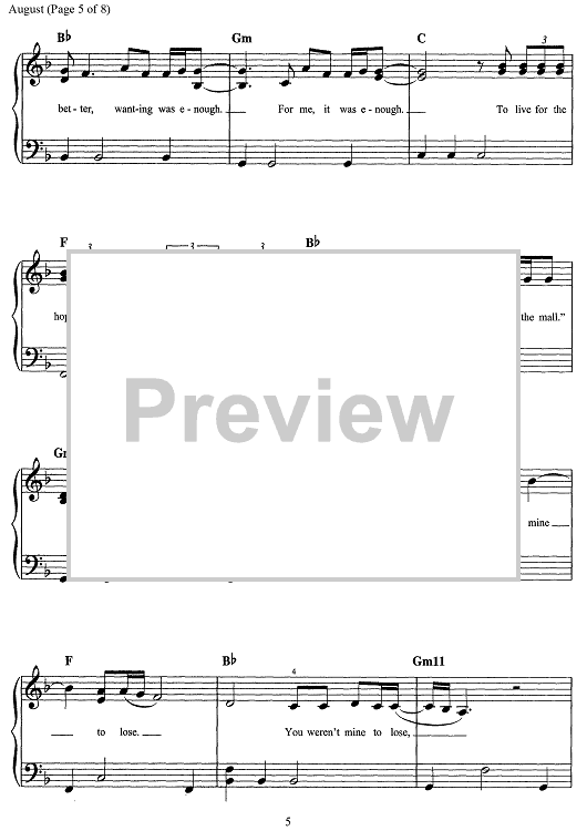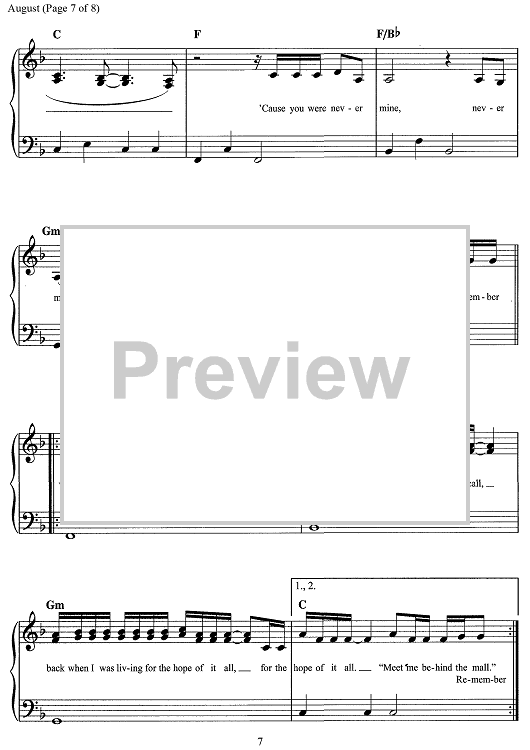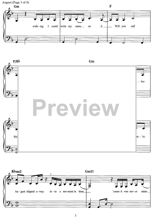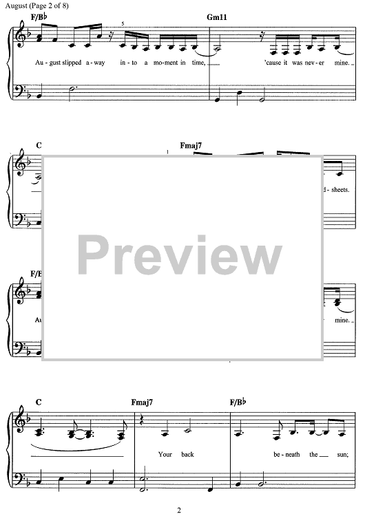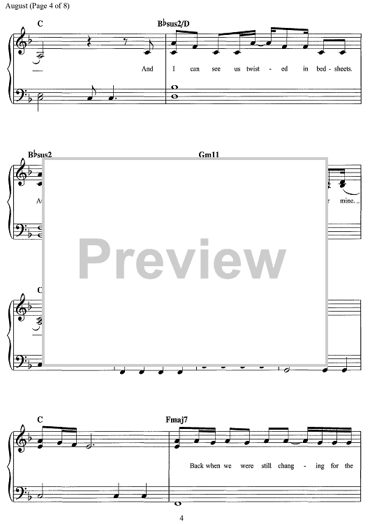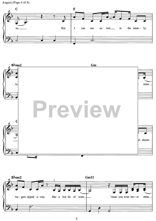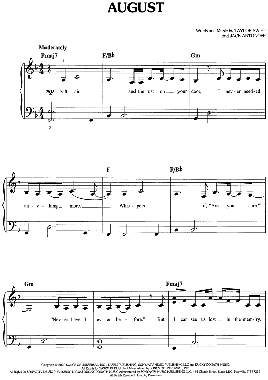 Digital Sheet Music for August by Taylor Swift, Jack Antonoff scored for Easy Piano/Vocal/Chords; id:468658