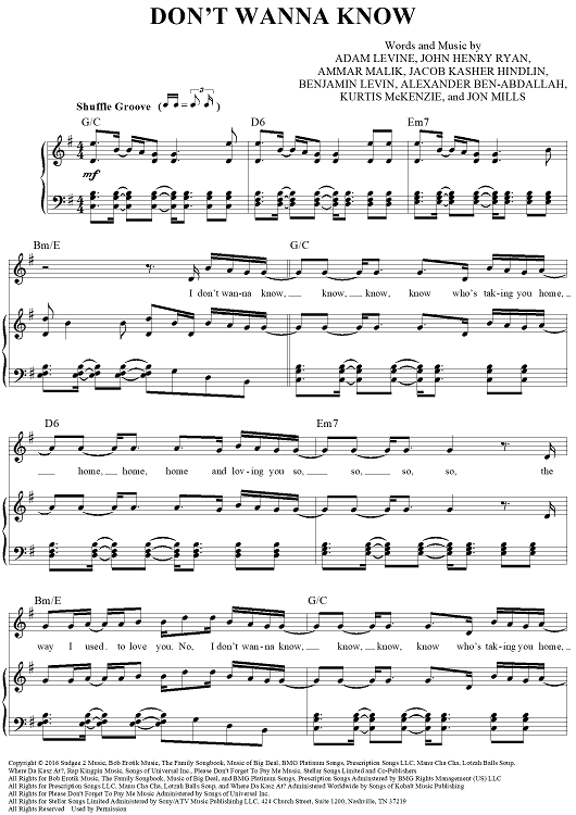 Digital Sheet Music for Don't Wanna Know by Adam Levine, Maroon 5, Benjamin Levin, Jacob Hindlin, Ammar Malik, Kurtis McKenzie, John Henry Ryan, Alexander Ben-Abdullah, Jon Mills scored for Piano/Vocal/Chords; id:462604