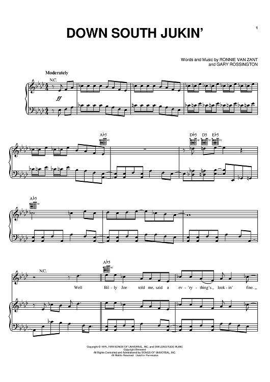 Digital Sheet Music for Down South Jukin' by Lynyrd Skynyrd, Gary Rossington, Ronnie Van Zant scored for Piano/Vocal/Chords; id:381602