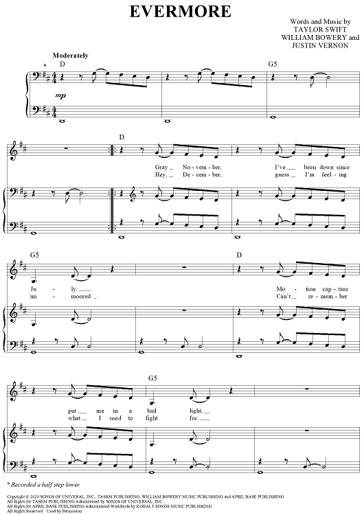 Digital Sheet Music for Evermore by Taylor Swift, Justin Vernon, William Bowery scored for Piano/Vocal/Chords; id:468763