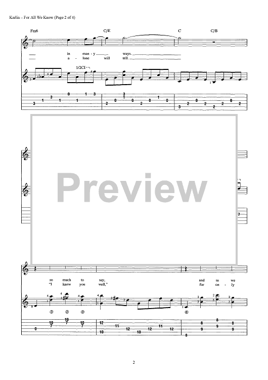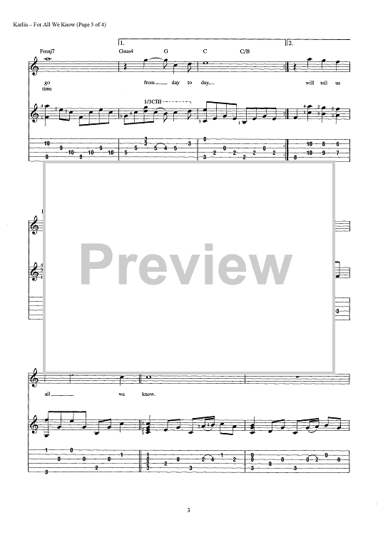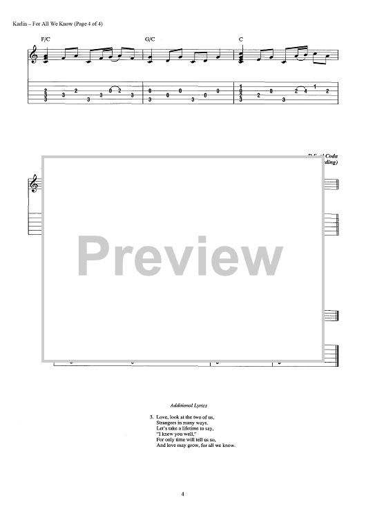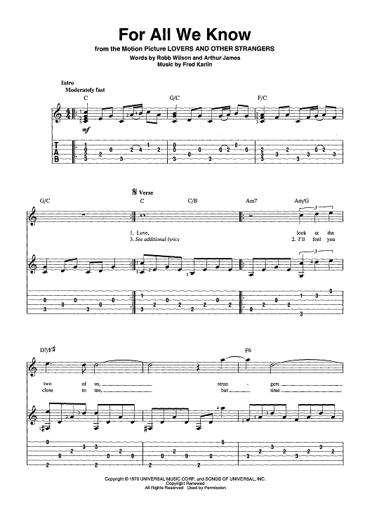 Digital Sheet Music for For All We Know by Fred Karlin, Robb Wilson, Arthur James scored for Guitar Tab/Vocal/Chords; id:442910