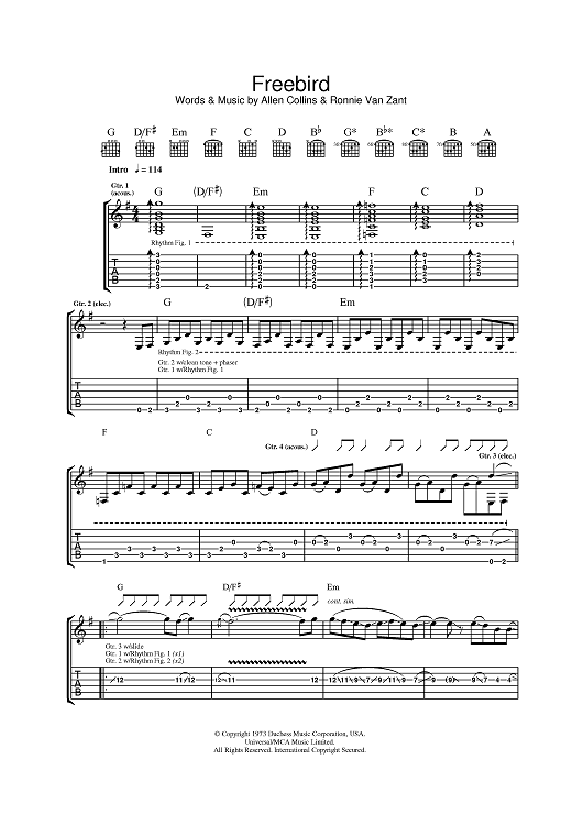 Digital Sheet Music for Free Bird by Lynyrd Skynyrd, Allen Collins, Ronnie Van Zant scored for Guitar Tab; id:387143