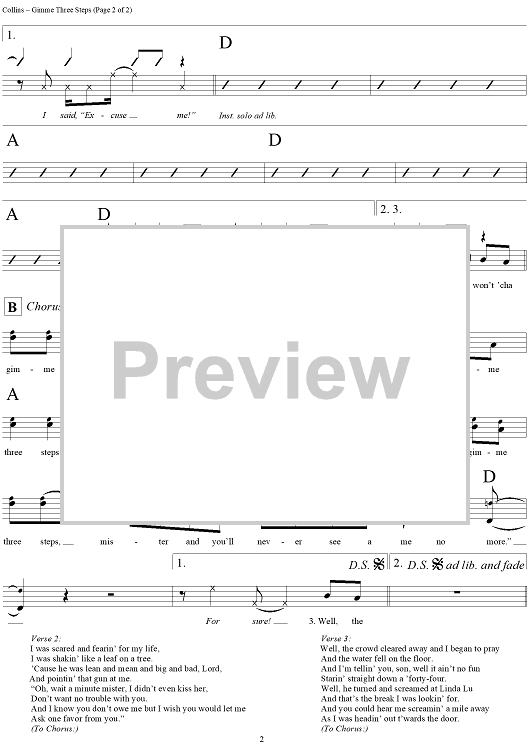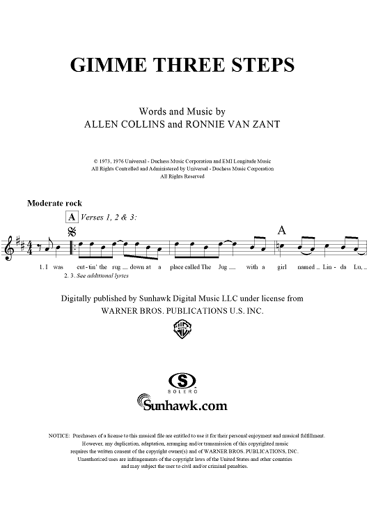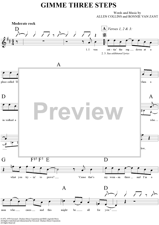 Digital Sheet Music for Gimme Three Steps by Lynyrd Skynyrd, Allen Collins, Ronnie Van Zant scored for Lead Sheet; id:293926