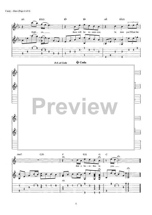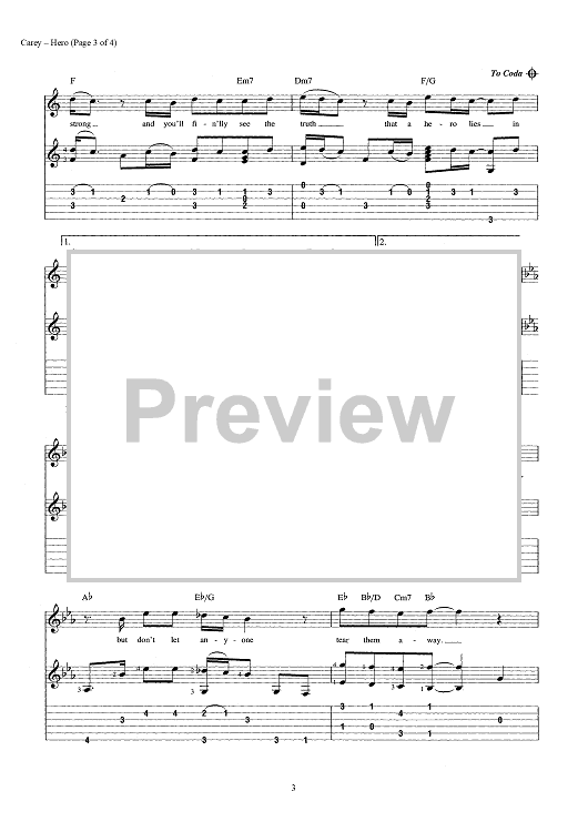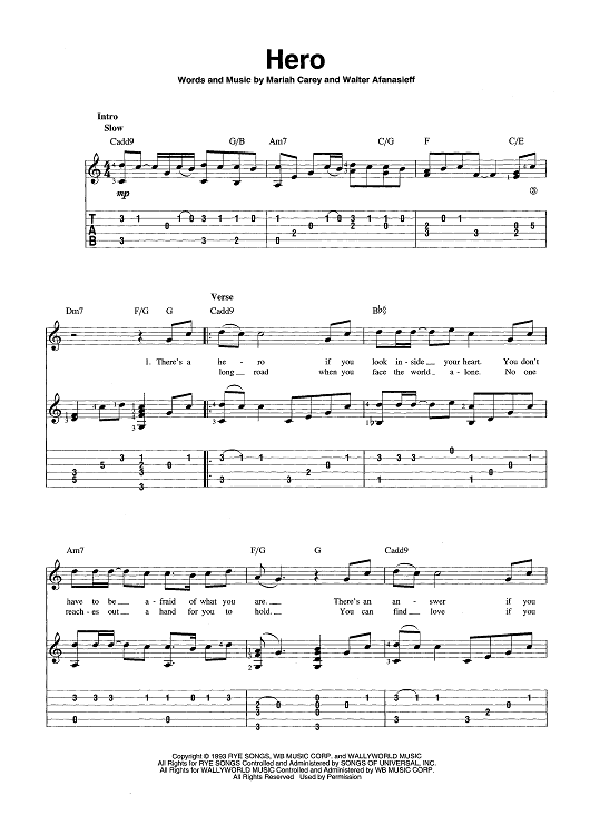 Digital Sheet Music for Hero by Mariah Carey, Wally Afanasieff scored for Guitar Tab/Vocal/Chords; id:442957