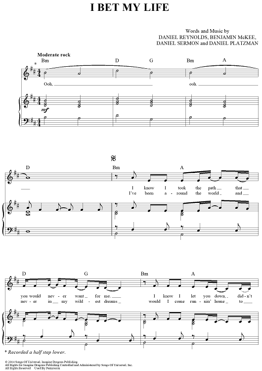 Digital Sheet Music for I Bet My Life by Daniel Reynolds, Benjamin McKee, Daniel Sermon, Imagine Dragons, Daniel Platzman scored for Piano/Vocal/Chords; id:449110