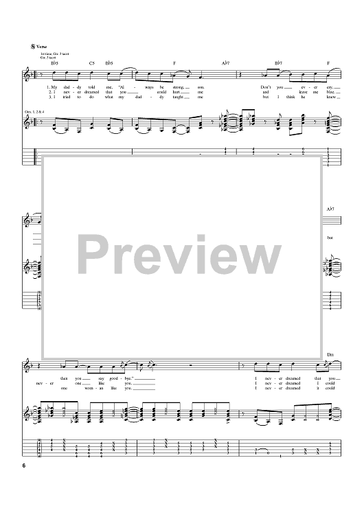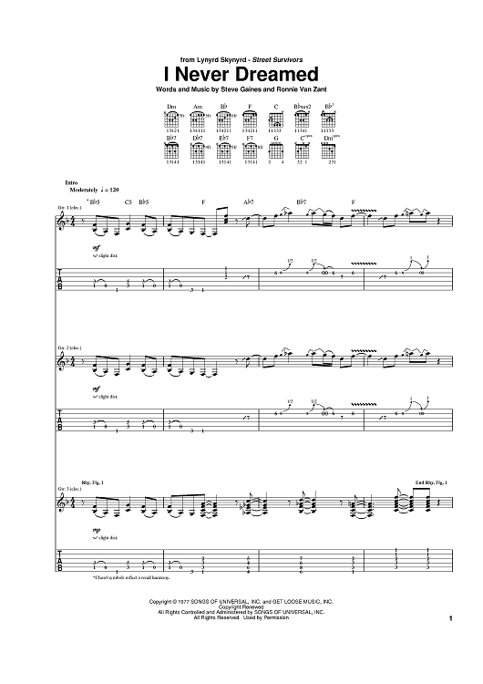 Digital Sheet Music for I Never Dreamed by Lynyrd Skynyrd, Ronnie Van Zant, Steve Gaines scored for Guitar Tab; id:391216