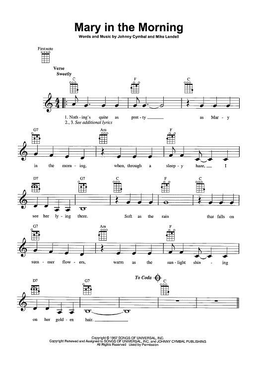 Digital Sheet Music for Mary in the Morning by Johnny Cymbal, Mike Lendell scored for Ukulele/Vocal; id:449042