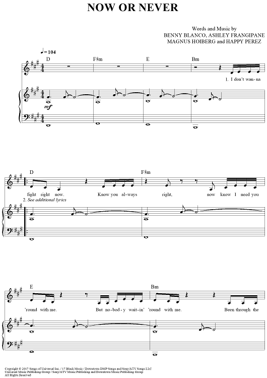 Digital Sheet Music for Now Or Never by Benny Blanco, Ashley Frangipane, Magnus Hoiberg, Happy Perez, Halsey scored for Piano/Vocal/Chords; id:464290