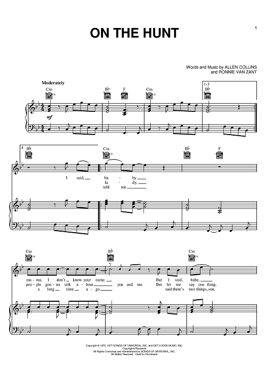 Digital Sheet Music for On The Hunt by Lynyrd Skynyrd, Allen Collins, Ronnie Van Zant scored for Piano/Vocal/Chords; id:381608
