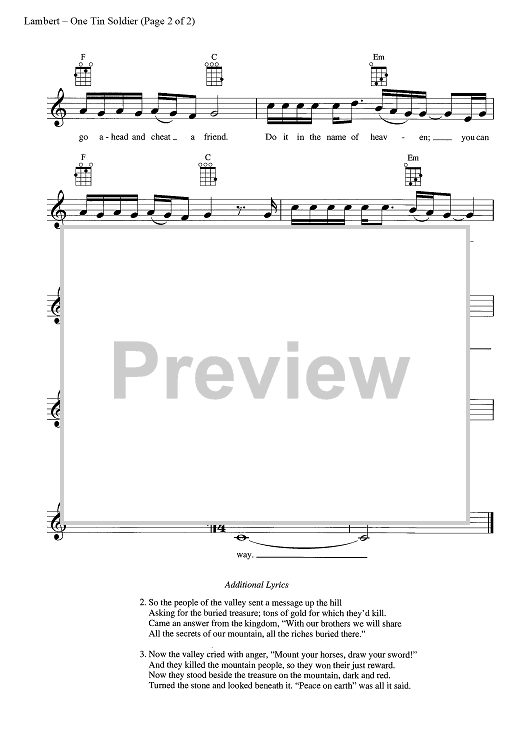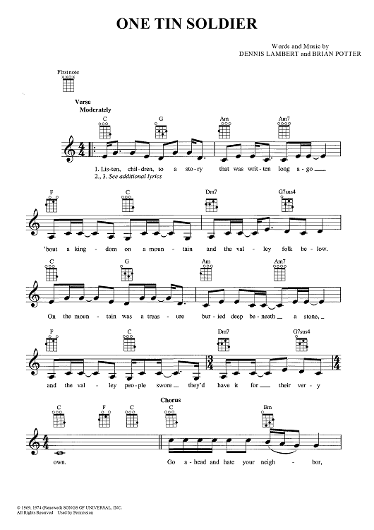 Digital Sheet Music for One Tin Soldier by Dennis Lambert, Brian Potter, The Original Caste scored for Ukulele/Vocal; id:449191