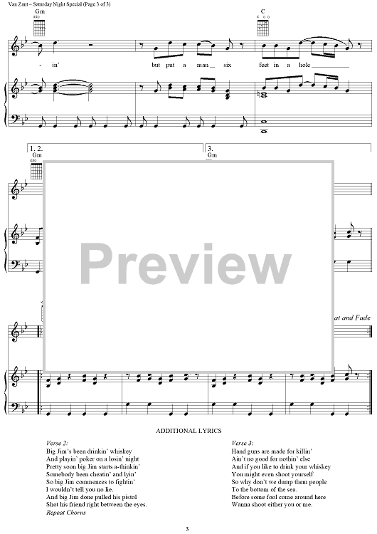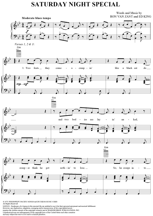 Digital Sheet Music for Saturday Night Special by Lynyrd Skynyrd, Ed King, Ronnie Van Zant scored for Piano/Vocal/Chords; id:219039