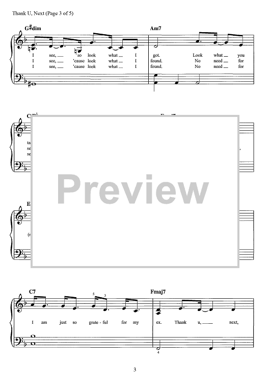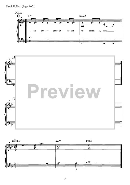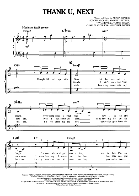 Digital Sheet Music for Thank U, Next by Michael Foster, Ariana Grande, Victoria McCants, Taylor Parks, Tommy Brown, Charles Anderson, Kimberly Krysiuk scored for Easy Piano/Vocal/Chords; id:467720