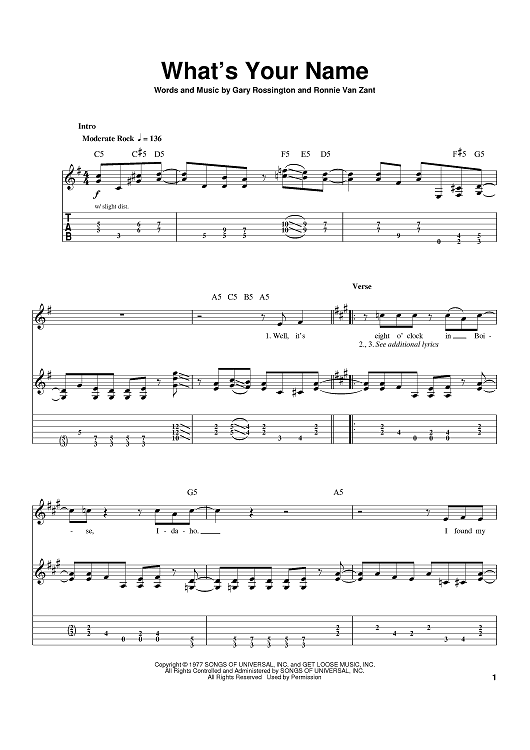 Digital Sheet Music for What's Your Name by Lynyrd Skynyrd, Gary Rossington, Ronnie Van Zant scored for Guitar Tab; id:389047