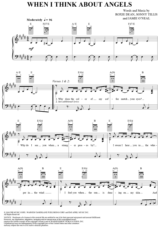 Digital Sheet Music for When I Think About Angels by Roxie Dean, Sonny Tillis, Jamie O'Neal scored for Piano/Vocal/Chords; id:283531