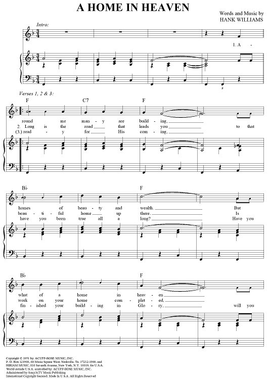 Digital Sheet Music for A Home in Heaven by Hank Williams scored for Piano/Vocal/Chords; id:263997