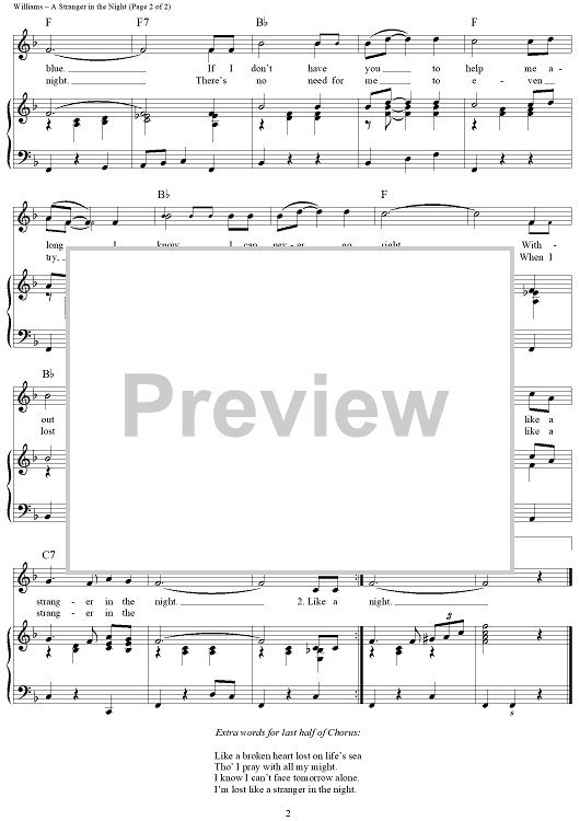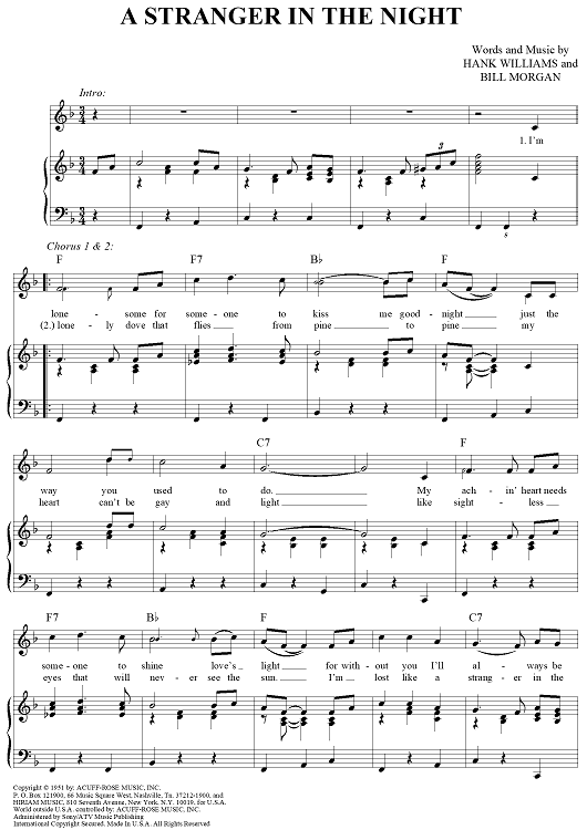 Digital Sheet Music for A Stranger in the Night by Hank Williams, Bill Morgan scored for Piano/Vocal/Chords; id:263880