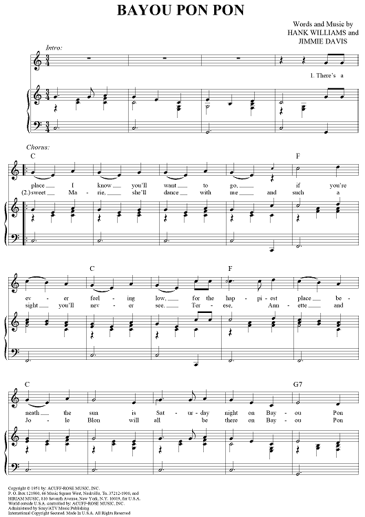 "Bayou Pon Pon" Sheet Music by Hank Williams