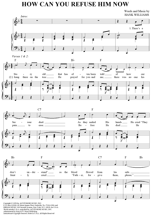 Digital Sheet Music for How Can You Refuse Him Now by Hank Williams scored for Piano/Vocal/Chords; id:264008