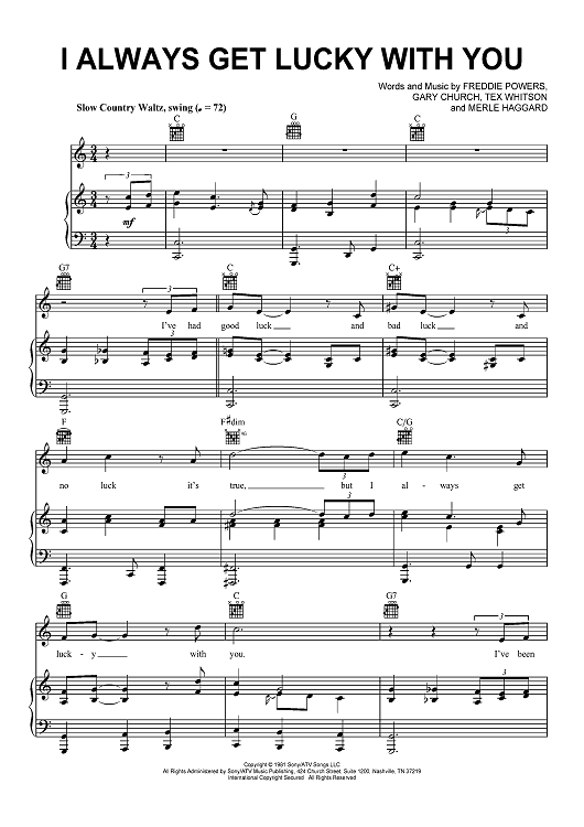 Digital Sheet Music for I Always Get Lucky With you by Merle Haggard, Freddie Powers, Gary Church, Tex Whitson scored for Piano/Vocal/Chords; id:467165