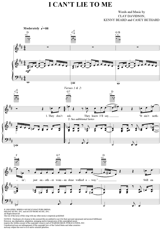 Digital Sheet Music for I Can't Lie to Me by Clay Davidson, Kenny Beard, Casey Bethard scored for Piano/Vocal/Chords; id:284212