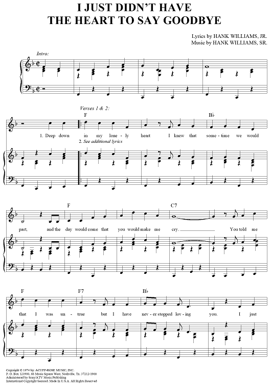"I Just Didn't Have the Heart to Say Goodbye" Sheet Music by Hank Williams