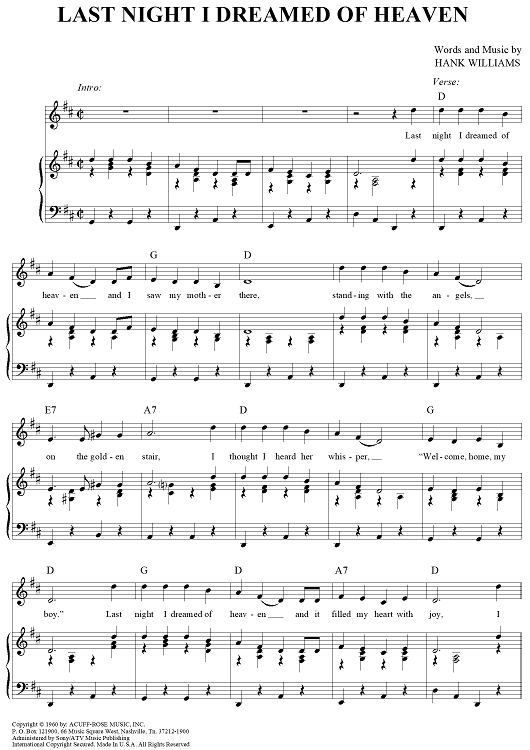 "Last Night I Dreamed of Heaven" Sheet Music by Hank Williams