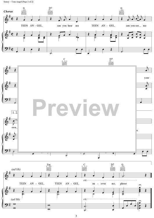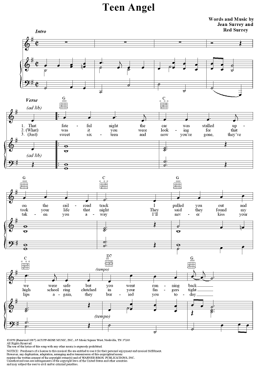 Digital Sheet Music for Teen Angel by Jean Surrey, Red Surrey, Mark Dinning scored for Piano/Vocal/Chords; id:110833