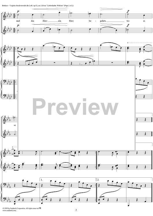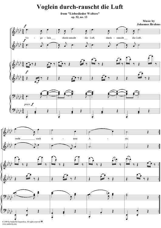 Digital Sheet Music for 13. Vöglein durch-rauscht die Luft by Johannes Brahms scored for Soprano/Alto/2 Pianos, 4 Hands; id:274327
