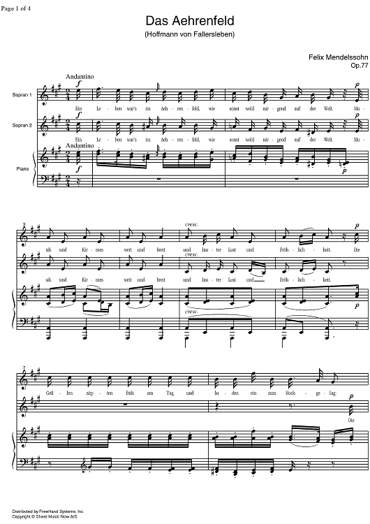 Digital Sheet Music for Das Aehrenfeld by Felix Mendelssohn scored for Two Sopranos/Piano; id:329480