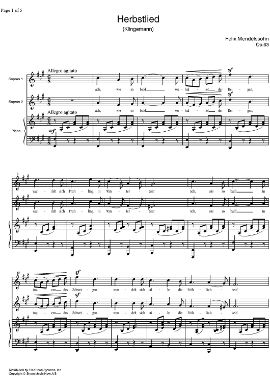 Digital Sheet Music for Herbstlied by Felix Mendelssohn scored for Two Sopranos/Piano; id:329476