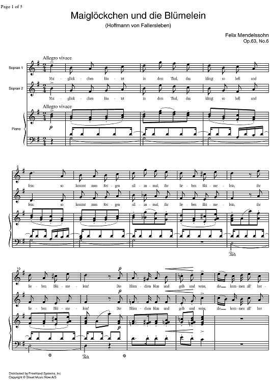 Digital Sheet Music for Maiglöckschen und die Blümelein by Felix Mendelssohn scored for Two Sopranos/Piano; id:329478