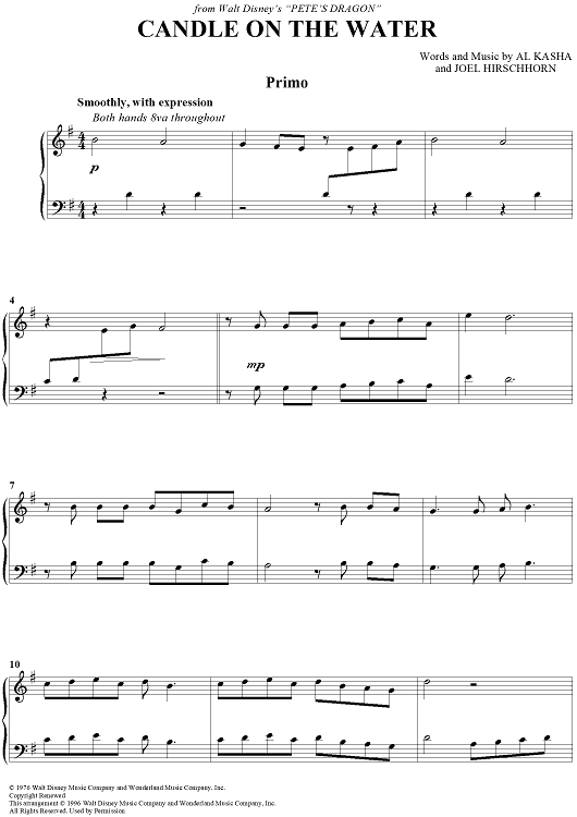 Digital Sheet Music for Candle On The Water by Al Kasha, Joel Hirschhorn scored for 1 Piano, 4 Hands; id:395841