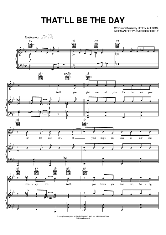 Digital Sheet Music for That'll Be The Day by Norman Petty, Buddy Holly, Jerry Allison, The Crickets scored for Piano/Vocal/Chords; id:385786