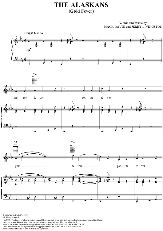 Digital Sheet Music for The Alaskans (Gold Fever) by Jerry Livingston, Mack David scored for Piano/Vocal/Chords; id:271873