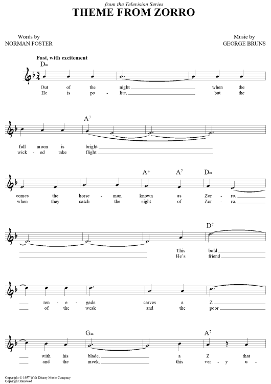 Digital Sheet Music for Theme From Zorro by George Bruns, Norman Foster scored for Lead Sheet; id:448608