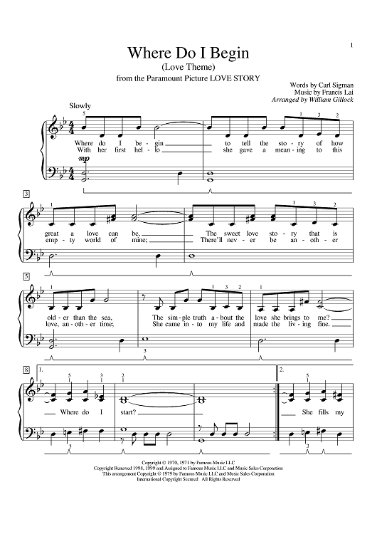 Digital Sheet Music for Where Do I Begin? by Andy Williams, Carl Sigman, Francis Lai, William Gillock scored for Piano; id:394398