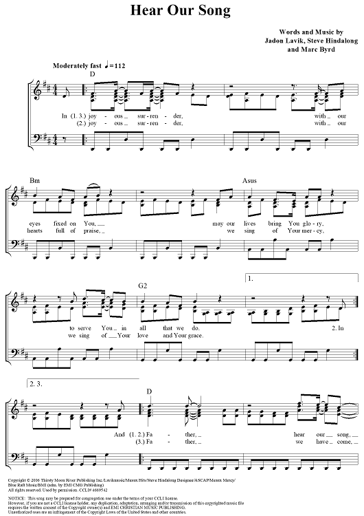 Digital Sheet Music for Hear Our Song by Marc Byrd, Steve Hindalong, Jadon Lavik scored for Piano/Vocal/Chords; id:355928
