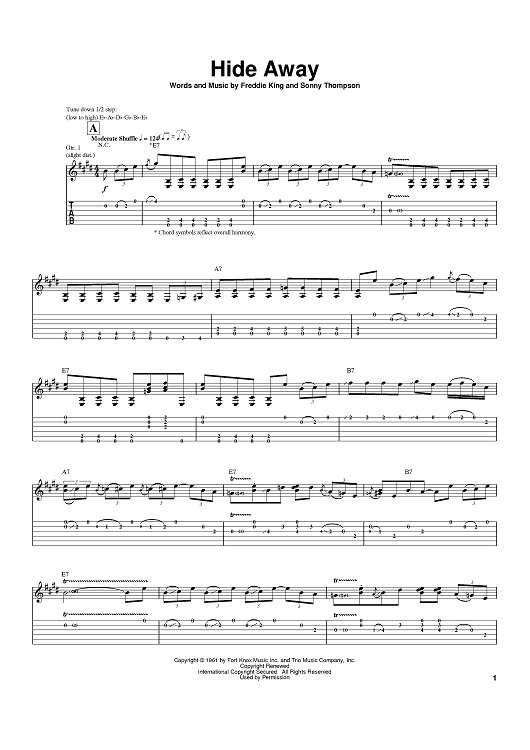 Digital Sheet Music for Hide Away by Eric Clapton, Stevie Ray Vaughan, Bluesbreakers, Freddie King, Sonny Thompson scored for Guitar Tab; id:397163